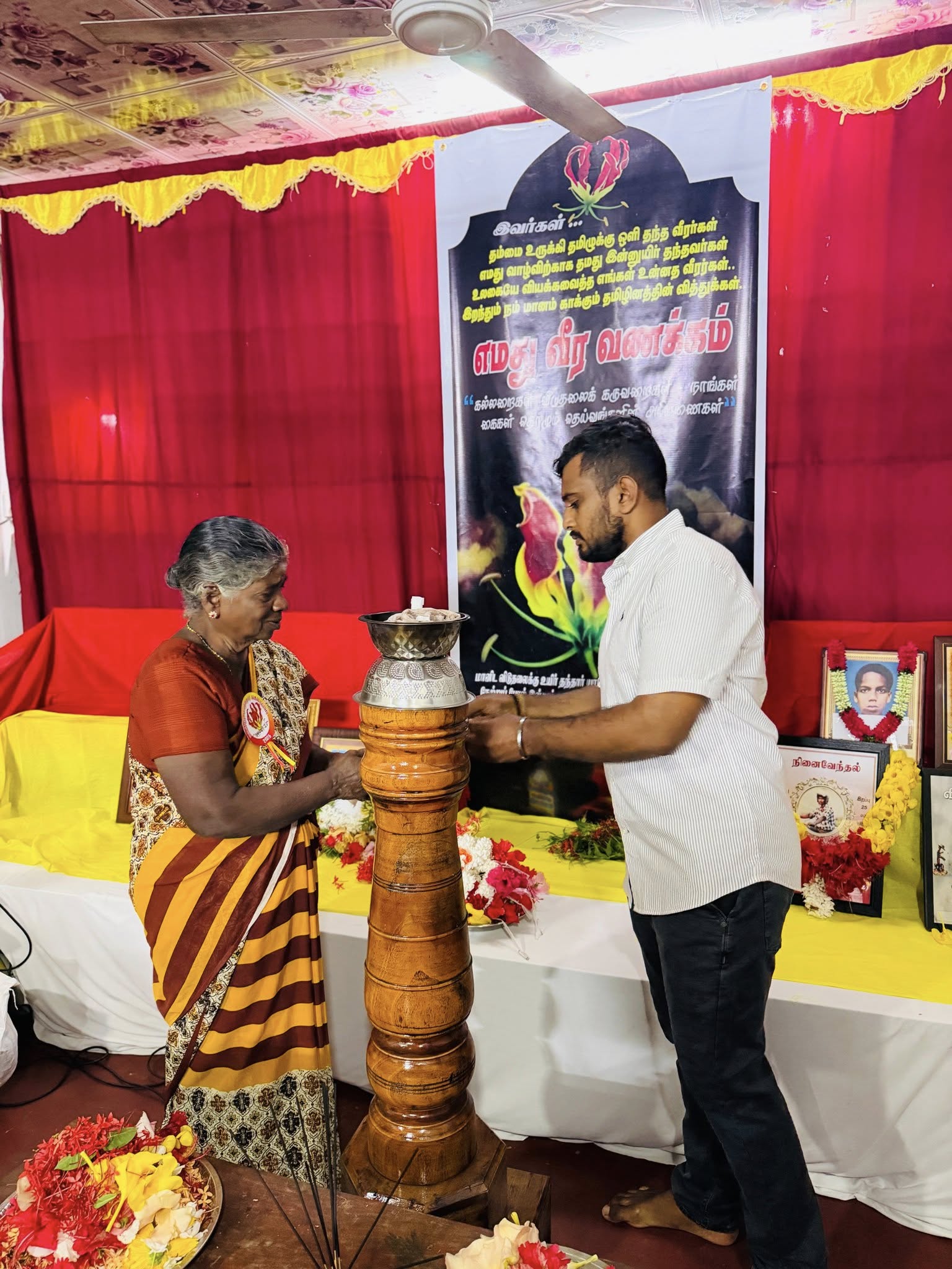 முன்னதாக ஊர்வலமாக அழைத்து வரப்பட்ட பெற்றோர் உரித்துடையவரில், இரு வீரர்களை மண்ணுக்கு ஈந்த சற்குணராசா தேவமனோகரி அம்மா பொதுச் சுடரை ஏற்றி வைத்தார். ஏனைய சுடர்கள் ஏற்றப்பட்டதைத் தொடர்ந்து அனைவரும் மலரஞ்சலி செலுத்தினர்.