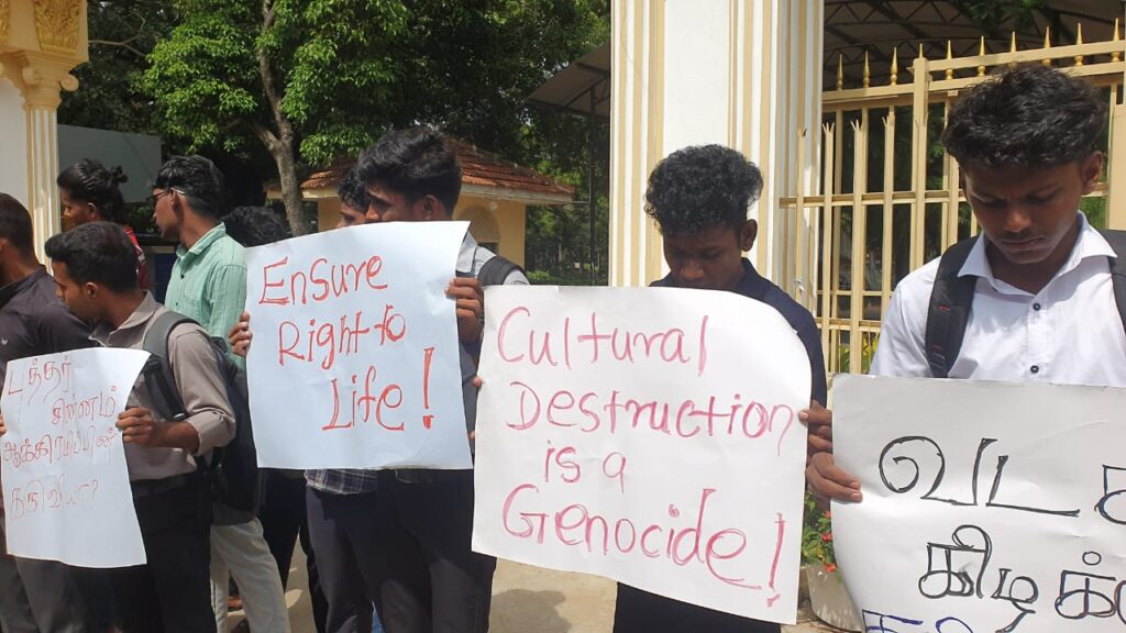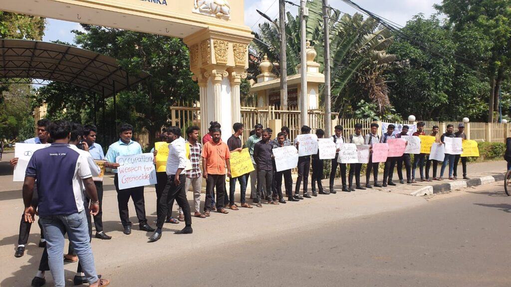 : தையிட்டி விகாரை விவகாரம் மற்றும் வடக்கு-கிழக்கில் தொடரும் பௌத்த ஆக்கிரமிப்புகளுக்கு எதிர்ப்புத் தெரிவித்து, யாழ்ப்பாணப் பல்கலைக்கழக மாணவர்கள் இன்று (22) பல்கலைக்கழக பிரதான நுழைவாயில் முன்பாகப் போராட்டமொன்றை முன்னெடுத்தனர்.