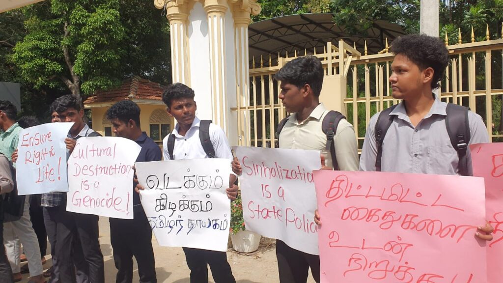 “தையிட்டி எங்கள் சொத்து”, “எங்கள் காணிகளை அபகரிக்காதே”, “பௌத்த ஆக்கிரமிப்பை உடன் நிறுத்து” போன்ற கோஷங்களை எழுப்பிய மாணவர்கள், தையிட்டியில் அமைக்கப்பட்டுள்ள சட்டவிரோத விகாரையை உடனடியாக அகற்ற வேண்டும் என வலியுறுத்தினர்.