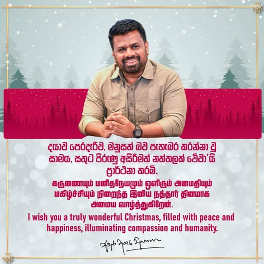 யதார்த்தத்தின் வேதனையான உண்மையை எதிர்கொண்டு, சவால்களை வென்று ஒரு நாடாக ஒன்றிணைந்து மீண்டெழுவோம் என்று அனைவருக்கும் அழைப்பு விடுத்து, அமைதி, மகிழ்ச்சி, மனிதநேயம், இரக்கம் மற்றும் கருணை ஆகியவற்றால் நிறைந்த இனிய நத்தார் பண்டிகையாக அமைய வேண்டும் என்று அனைவரையும் வாழ்த்துகிறேன்.