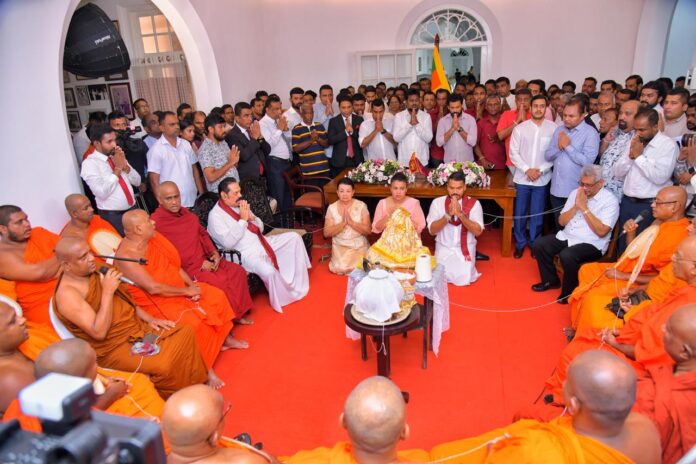விஜேராமவில் உள்ள மஹிந்த ராஜபக்ஷவின் இல்லத்தில் நாமல் ராஜபக்ச வேட்பு மனுவில் கையொப்பமிட்டார்.