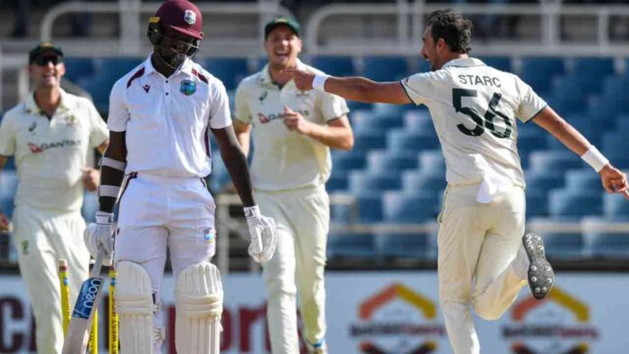 பதிலுக்கு தனது முதல் இன்னிங்ஸில் துடுப்பெடுத்தாடிய மேற்கிந்திய தீவுகள் அணி, சாய் ஹோப் (48) மற்றும் ராஸ்டன் சேஸ் (44) ஆகியோரின் பங்களிப்புடன் 190 ஓட்டங்கள் எடுத்து 10 ஓட்டங்கள் முன்னிலை பெற்றது. மிட்செல் ஸ்டார்க் 3 விக்கெட்டுகளை வீழ்த்தினார்.