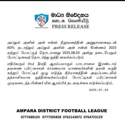 அப்துல் அஸீஸ் அன்ட் சன்ஸ் வெற்றிக் கிண்ணம்-2025 ஜுலை மாதம் 12 ஆந் திகதி ஆரம்பமாகி சிறப்பாக நடைபெற்று வந்தது.குறித்த மின்னொளி உதைபந்தாட்ட சுற்றுப்போட்டியை அம்பாரை மாவட்ட உதைபந்தாட்ட சம்மேளனம் மற்றும் அம்பாறை மாவட்ட நடுவர் சங்கம் உள்ளிட்ட அமைப்புகள் முன்னின்று நடாத்தி வந்தன.எதிர்வரும் ஆகஸ்ட் மாதம் 5 ஆந் திகதி கல்முனை கல்வி வலயங்களுக்கு உட்பட்ட முஸ்லீம் பாடசாலைகளில் நடைபெறவுள்ள இரண்டாம் தவணை பரீட்சையை கருத்திற் கொண்டும் மாணவர்களின் கல்வி நலனை அடிப்படையாக கொண்டும் எம்மால் நடாத்தப்படும் சுற்றுப்போட்டியின் பிரதான அணுசரனையாளர் மருதமுனை ஏரிபொருள் நிரப்பு நிலையமான அப்துல் அஸீஸ் அன்ட் சன்ஸ் நிறுவனத்தின் பணிப்பாளர் சமூக சேவகர் அப்துல் அஸிஸ் அப்துல் கபீல் அவர்களின் வேண்டுகோளிற்கமைய இச்சுற்றுப் போட்டித் தொடரானது 2025.08.03 அன்று முதல் நடைபெறும் போட்டிகளைத் தொடர்ந்து ஒத்தி வைக்க தீர்மானித்துள்ளொம்.